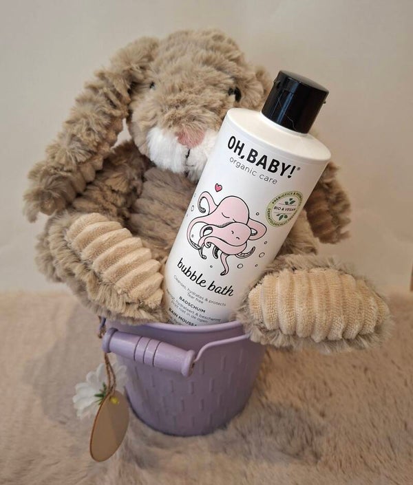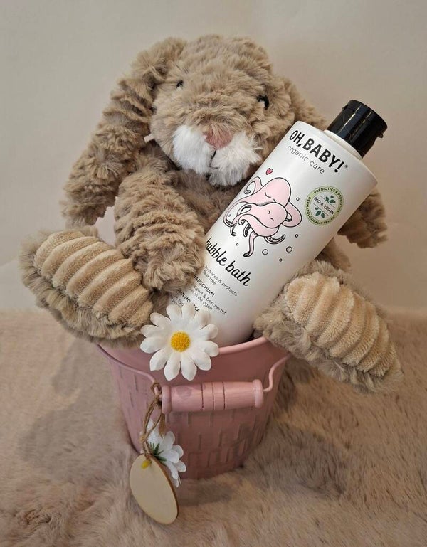 Paasmandje gevuld met konijnenknuffel (@clayre & eef) en badschuim van Oh Baby! (@ohbabyorganiccare)*.